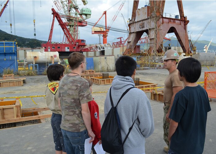 SASEBO, Japan (Nov. 1, 2012) Builder 3rd Class Brian Whelan, of Naval Mobile Construction Battalion (NMCB) 74, Detail Sasebo, shares Seabee construction concepts with members of The Far East Council of Boy Scouts, Troop 76, as part of a jobsite tour enabeling the Boy Scouts to earn their Engineering Merit badges. NMCB 74 is supporting national security strategy by building lasting relationships with host nations, paving the way for future partneships. (U.S. Navy photo by Equipment Operator 3rd Class Craig Enjaian)