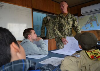 SASEBO, Japan (Nov. 1, 2012) Builder 2nd Class David Drean, of Naval Mobile Construction Battalion (NMCB) 74, Detail Sasebo, Presents design drawings to members of The Far East Council of Boy Scouts, Troop 76 at Fleet Activities Sasebo Japan. NMCB 74 is supporting national security strategy by building lasting relationships with host nations, paving the way for future partneships. (U.S. Navy photo by Equipment Operator 3rd Class Craig Enjian) (RELEASED)