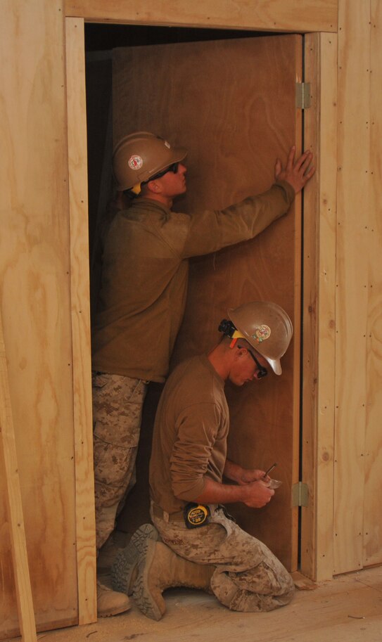 Builder Constructionman Phillip Schwenk, right, and Builder 3rd Class Brian Gilliam of Naval Mobile Construction Battalion (NMCB) 133, Task Force Anchor, install an interior door at a project site aboard Camp Leatherneck. NMCB 133 is currently deployed to Afghanistan in support of engineering operations for coalition forces, the Afghan National Army and the local population. (U.S. Navy photo by Mass Communication Specialist 1st Class Steven Myers/Released)