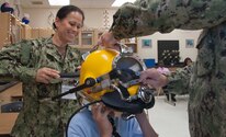 VIRGINIA BEACH, Va. (Oct. 1, 2013) -- Cmdr. Eileen D'Andrea the executive officer of Amphibious Construction Battalion (PHIBCB) TWO let students try on a Diver helmet to show middle school students about how science and engineering play a huge role in the Navy during the third annual Science Technology Engineering and Math (STEM) career conference at the Corporate Landing Middle School in Virginia Beach. (U.S. Navy photo by MC3 Taylor Mohr/Released)