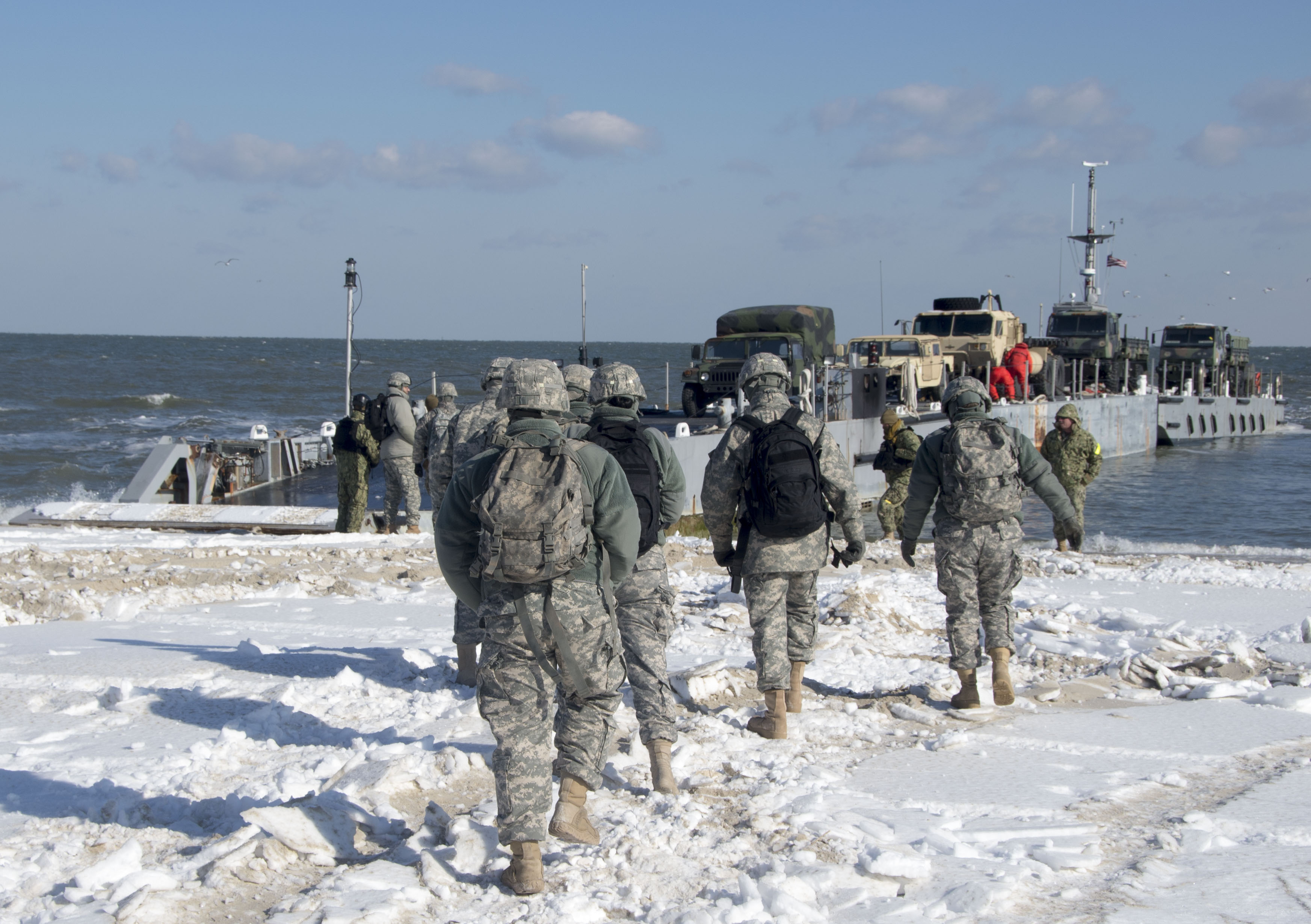 JOINT EXPEDITIONARY BASE LITTLE CREEK-FORT STORY, Va. (Feb. 20, 2015) – Sailors assigned to Amphibious Construction Battalion (PHIBCB) 2 and Beach Master Unit (BMU) 2, as well as Soldiers from the 11th Transportation Battalion conduct Logistics Over the Shore (LOTS) at Anzio Beach during exercise Blue Heron. The purpose of the exercise is to increase interoperability between Army and Navy commands during Joint Logistics Over the Shore (JLOTS) missions. (U.S. Navy Photos by Mass Communication Specialist 3rd Class Taylor Mohr)